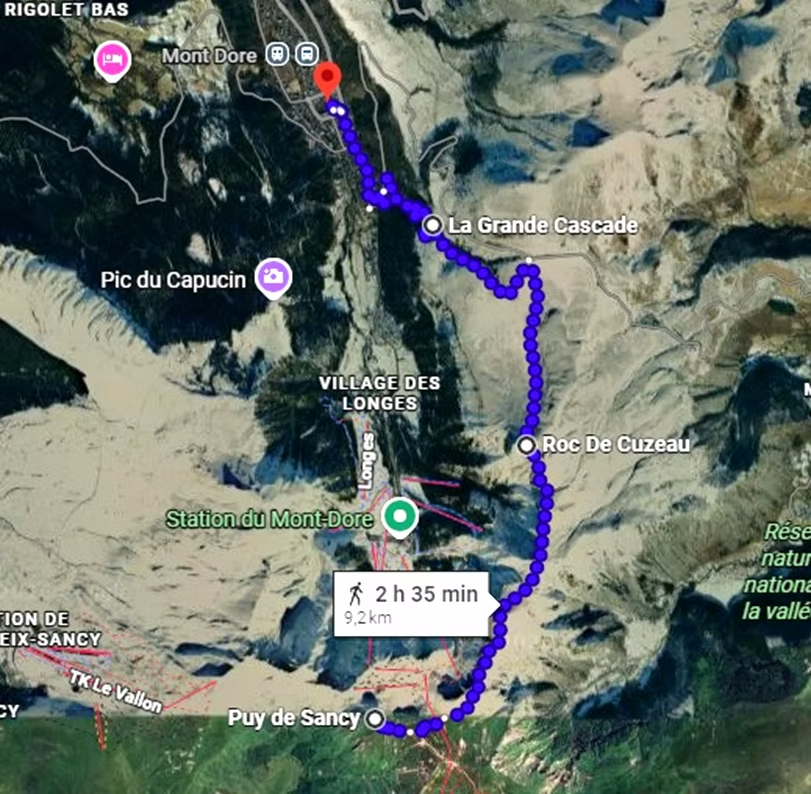 Le lendemain, nous nous sommes aventurés sur ce que nous avons surnommé le «trajet long»: celui qui va du Puy de Sancy, plus précisément de la gare de son téléphérique, jusqu’à la Grande Cascade, puis en descendant dans la localité de Mont-Dore. Un parcours de près de 9 kilomètres avec une dénivelée positive (en montée) d'environ 300 mètres et une dénivelée négative (en descente) de 1 000 mètres. Le sentier parcourt toute la crête entre le Puy de Sancy et la Grande Cascade.